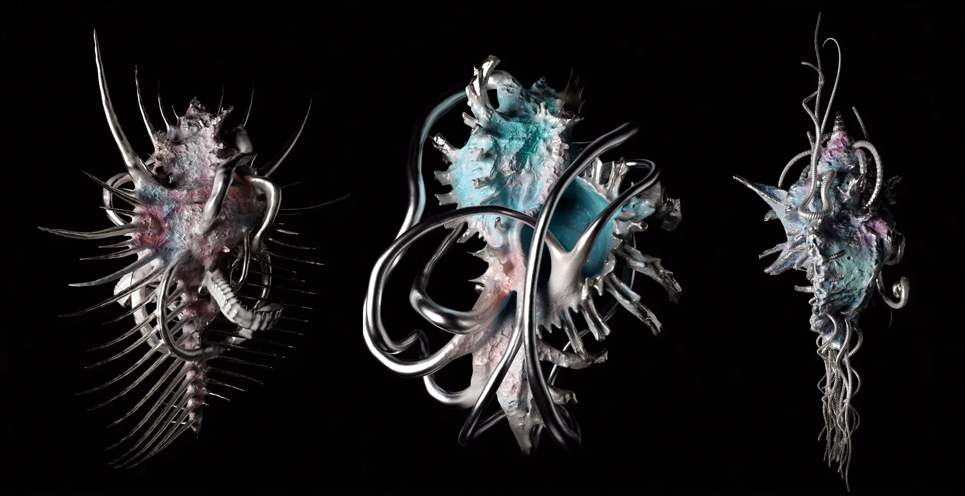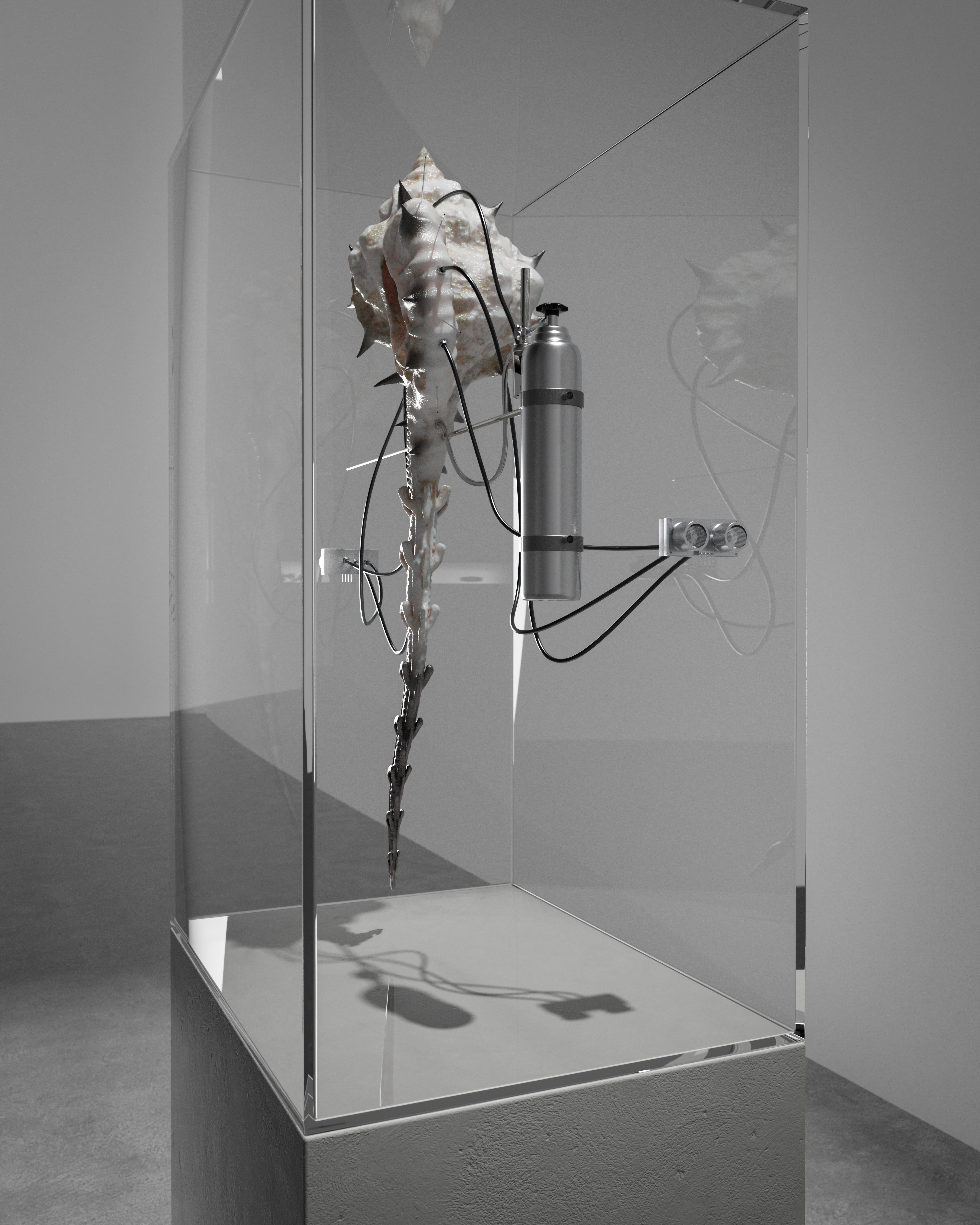 There are many works I could mention, as each piece is connected to a specific moment in my practice and reflects a particular way of thinking or feeling at that time. One project that remains important to me is Xenopunk, developed in 2022 in collaboration with Transmoderna. It is a virtual reality experience and immersive 360 installation exhibited in NXT Museum in Amsterdam, where the viewer enters a post-ecological environment inhabited by hybrid beings. These entities adapt to hostile conditions by integrating technology, debris, and synthetic materials into their bodies. The work explores survival as a functional process, where what appears damaged or unsettling is in fact necessary for existence. Being able to experience these forms from within the environment, rather than observing them from the outside, was a key moment in the development of my work. Another piece is Case Study 01: The Torso, part of my speculative anatomy series. This work focuses on the body as a site of pressure and transformation. The torso is reinforced through metallic grafts and prosthetic structures that both sustain and restrict it. The piece reflects a condition where the systems designed to support the body also impose limitations, creating a tension between endurance and constraint. More recently, I have been developing works within the Forme Evolutae series, particularly the clinical phase. One piece I am currently working on is a seashell specimen presented inside a glass vitrine and connected to an external respiratory system. The work originated from a shell I found while diving, which I then captured digitally through a digital process called photogrammetry and extended into a new form. It is now being developed as a physical installation, marking a shift from digital representation to tangible presence.