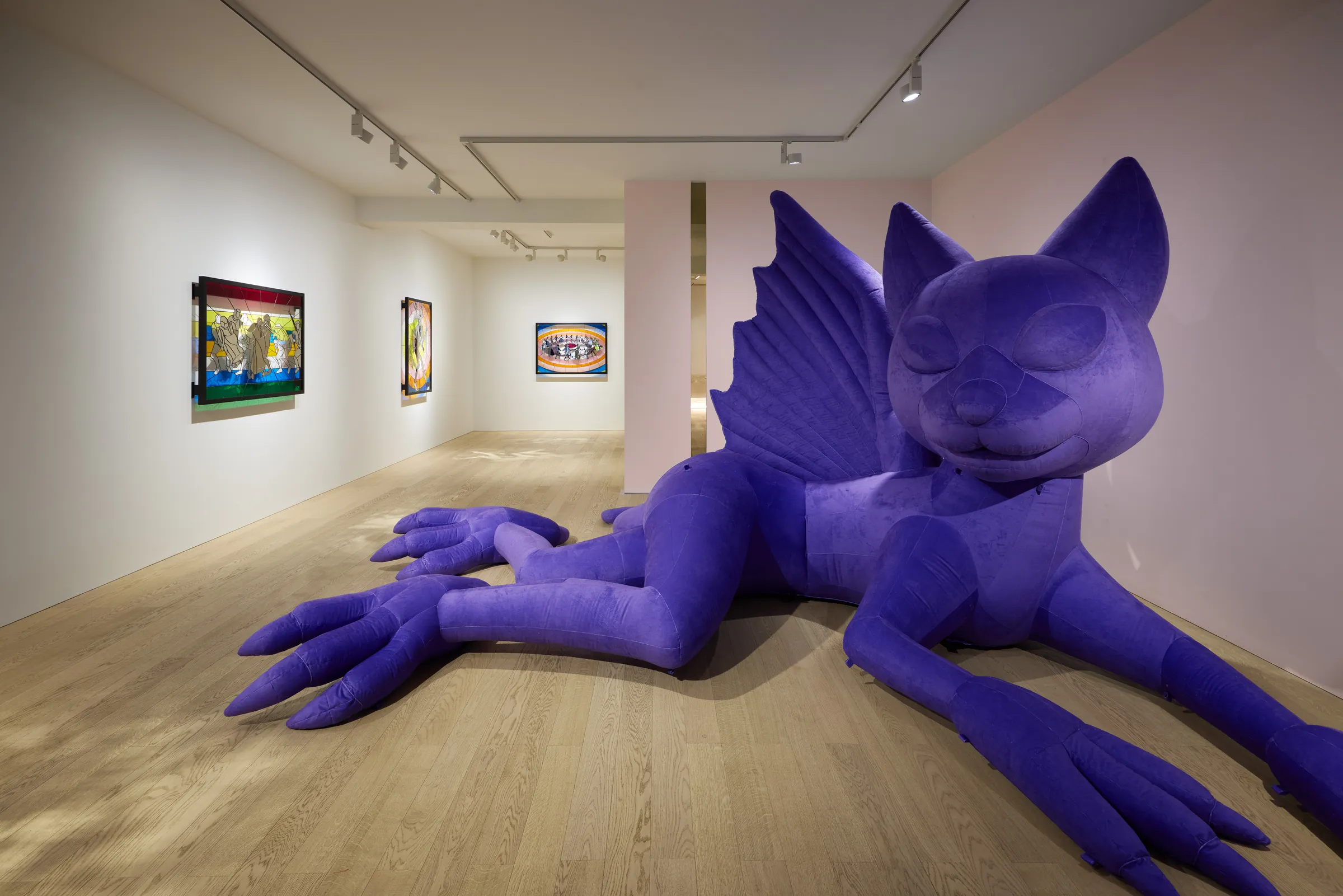Alongside these stained-glass works, Kjær presents an inflatable dragon sculpture. The sheer velvet surface of the work is reminiscent of a camera flash or a photographer’s reflector. The otherworldly sculpture appears like a hallucination, its textured surface catching and scattering light in ways that heighten spatial awareness and cultivate a richly sensorial experience. Kjær drags the medieval folkloric motif of the dragon into the present day, commenting on the all-encompassing nature of the technological monster, the digital revolution. The inflatable dragon serves as an indication of how digital representations of the self, despite all the surface level glamour, are perennially searching for something unreal, fantastical, and non-existent.   This exhibition opens at a period of great significance for Kjær, with numerous forthcoming institutional exhibitions in 2026.